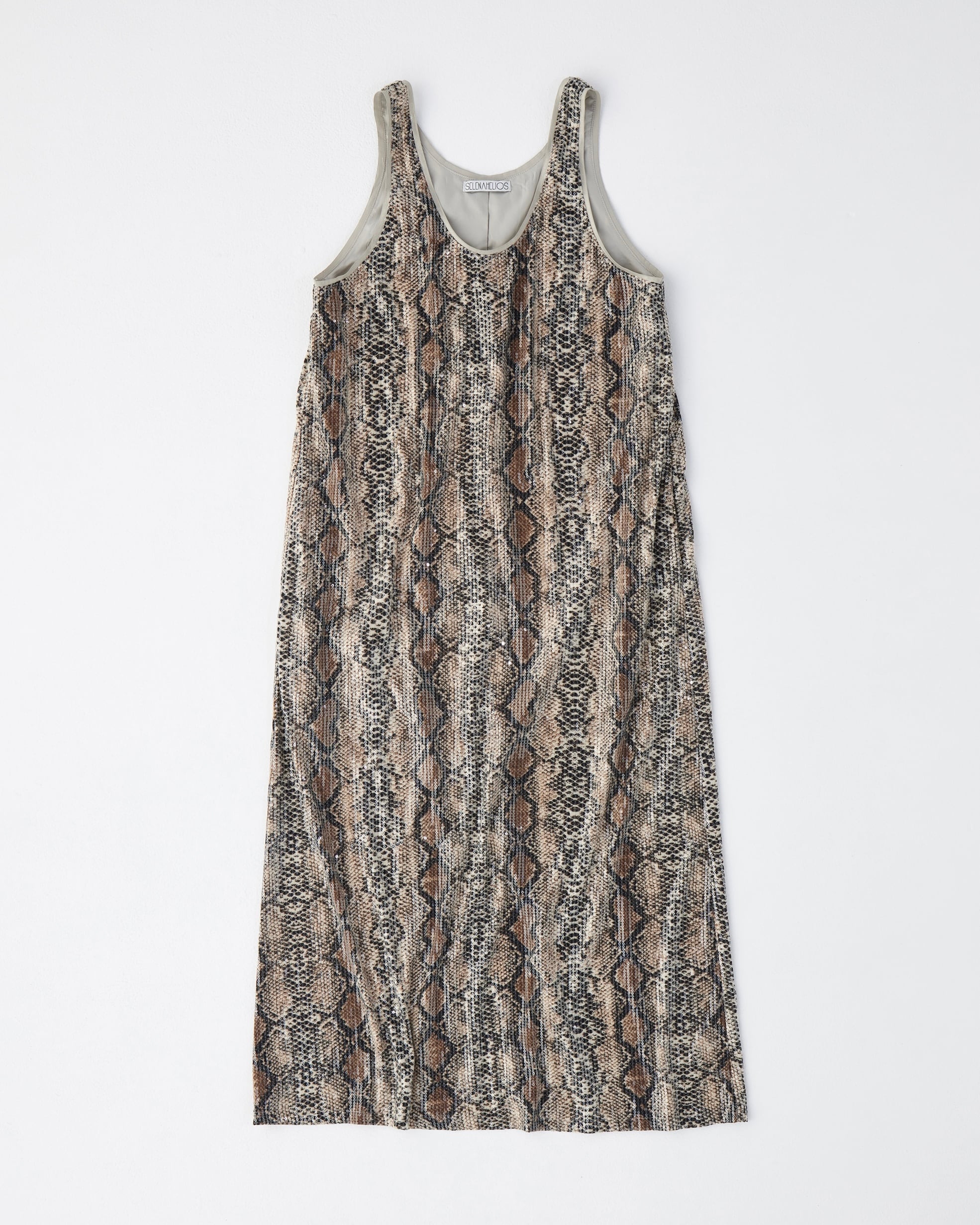 パイソン柄のプリントにスパンコールを敷詰めた、エッジーでラグジュアリーなタンクワンピース。