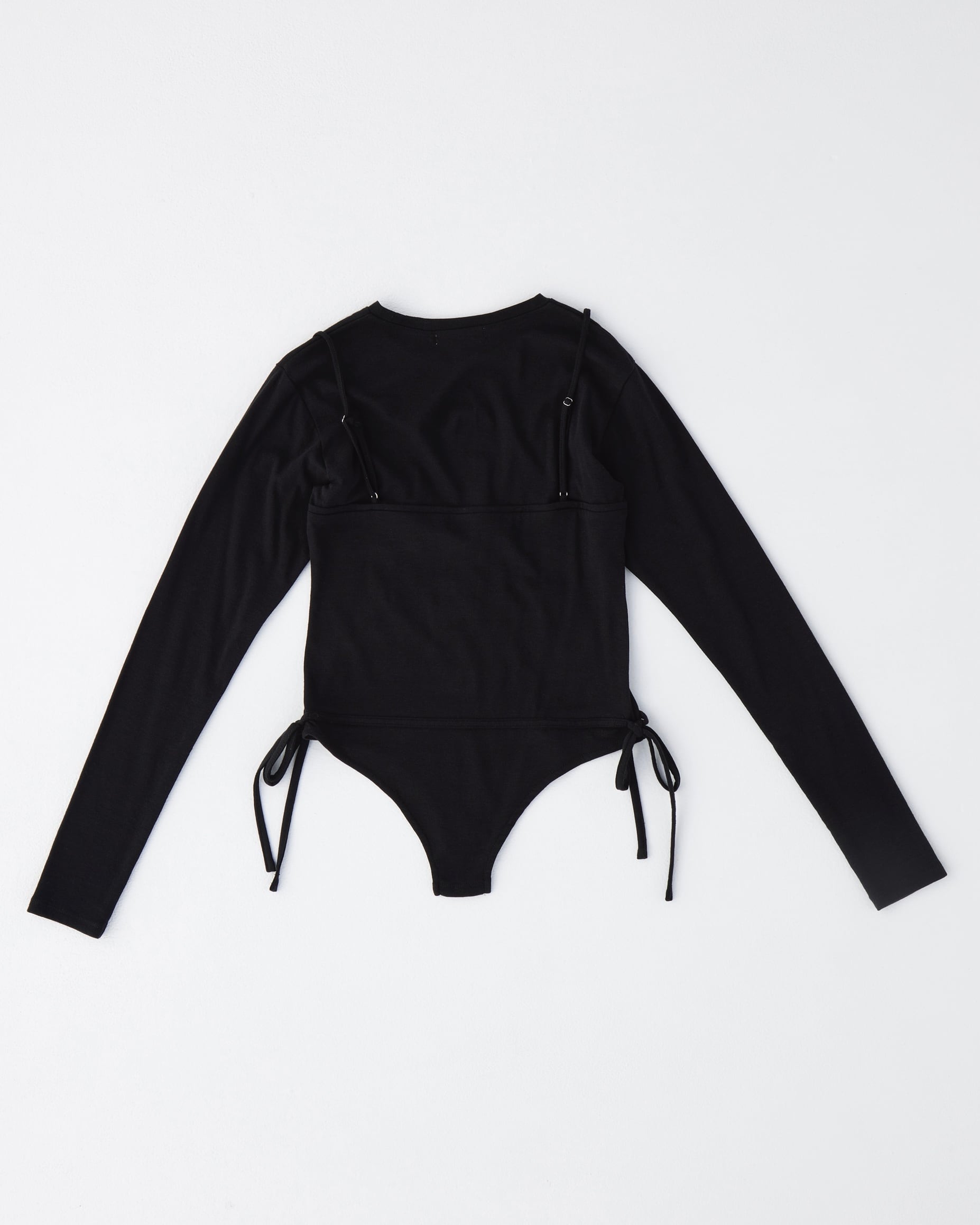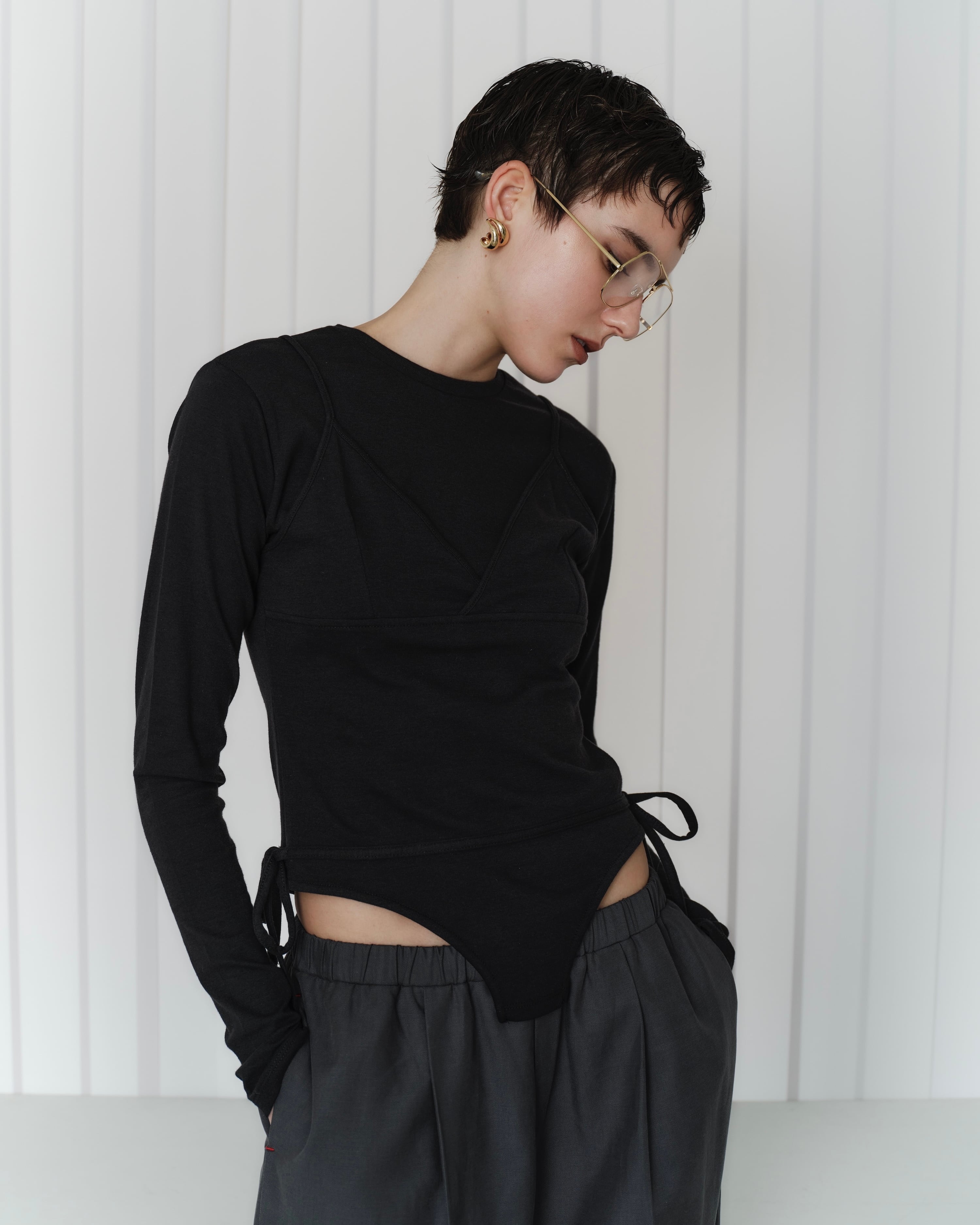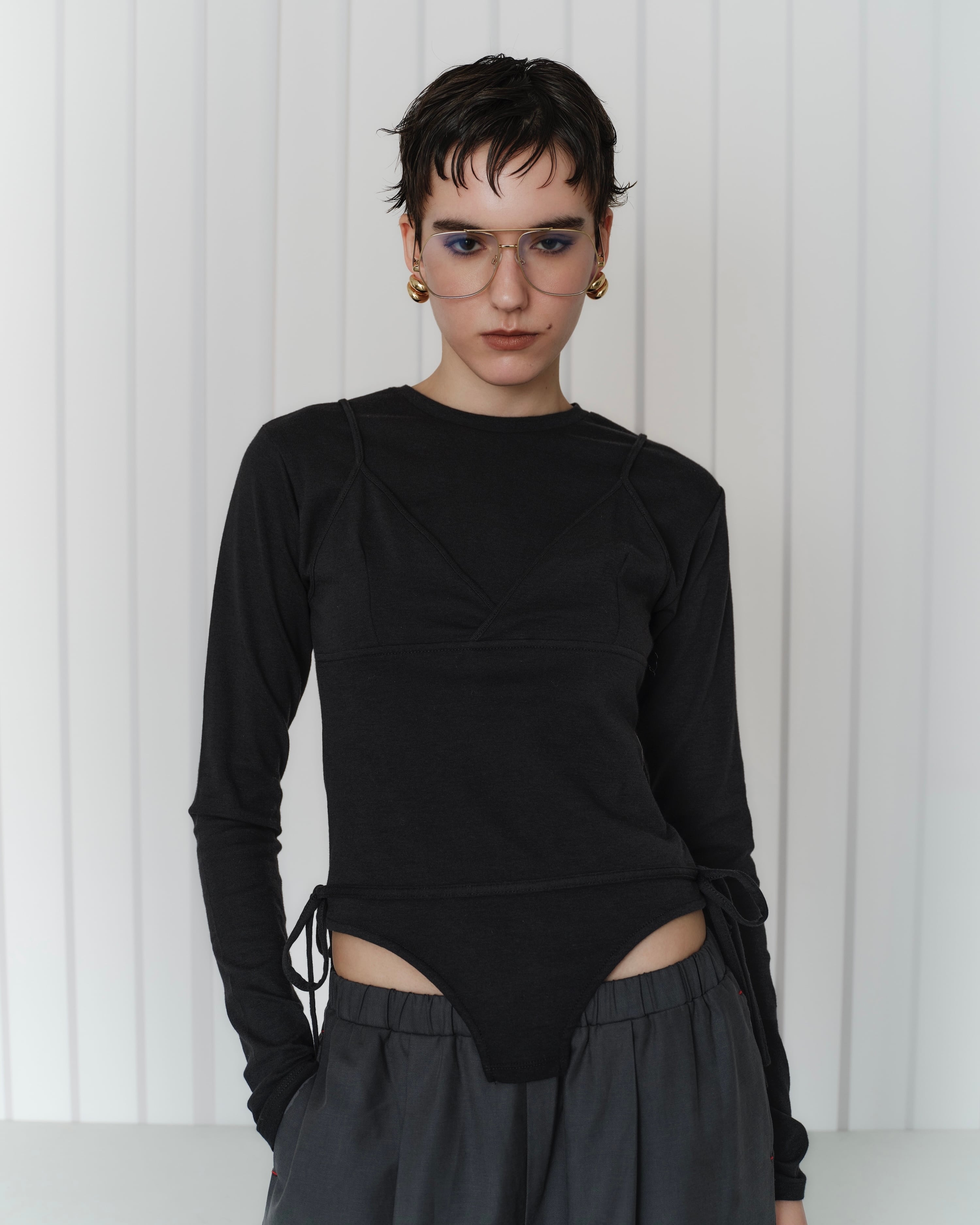 キャミソールのレイヤードデザインで、一枚で重ね着風に見せてくれ、裾はボディスーツのようなカッティングで少しエッジーな印象に。