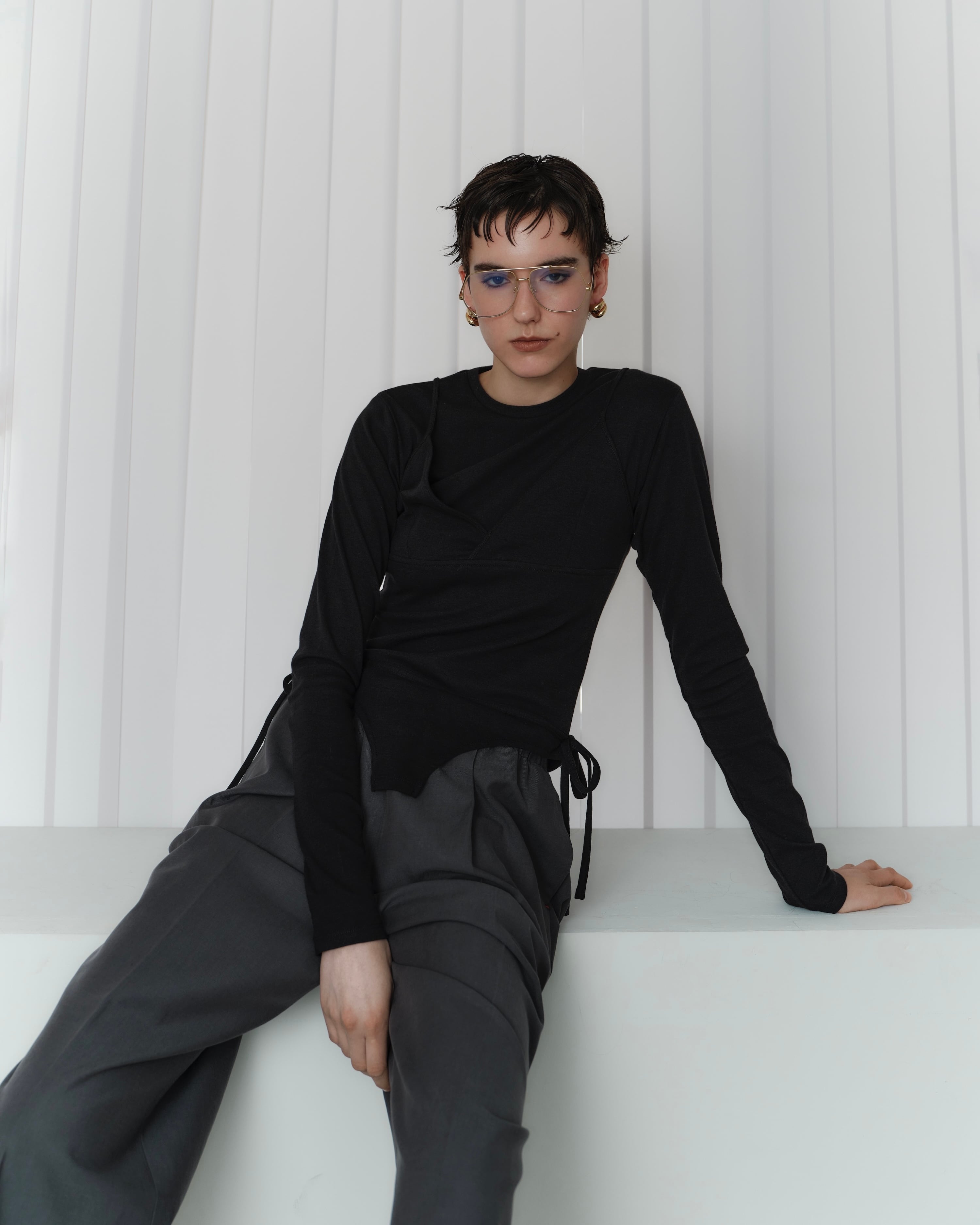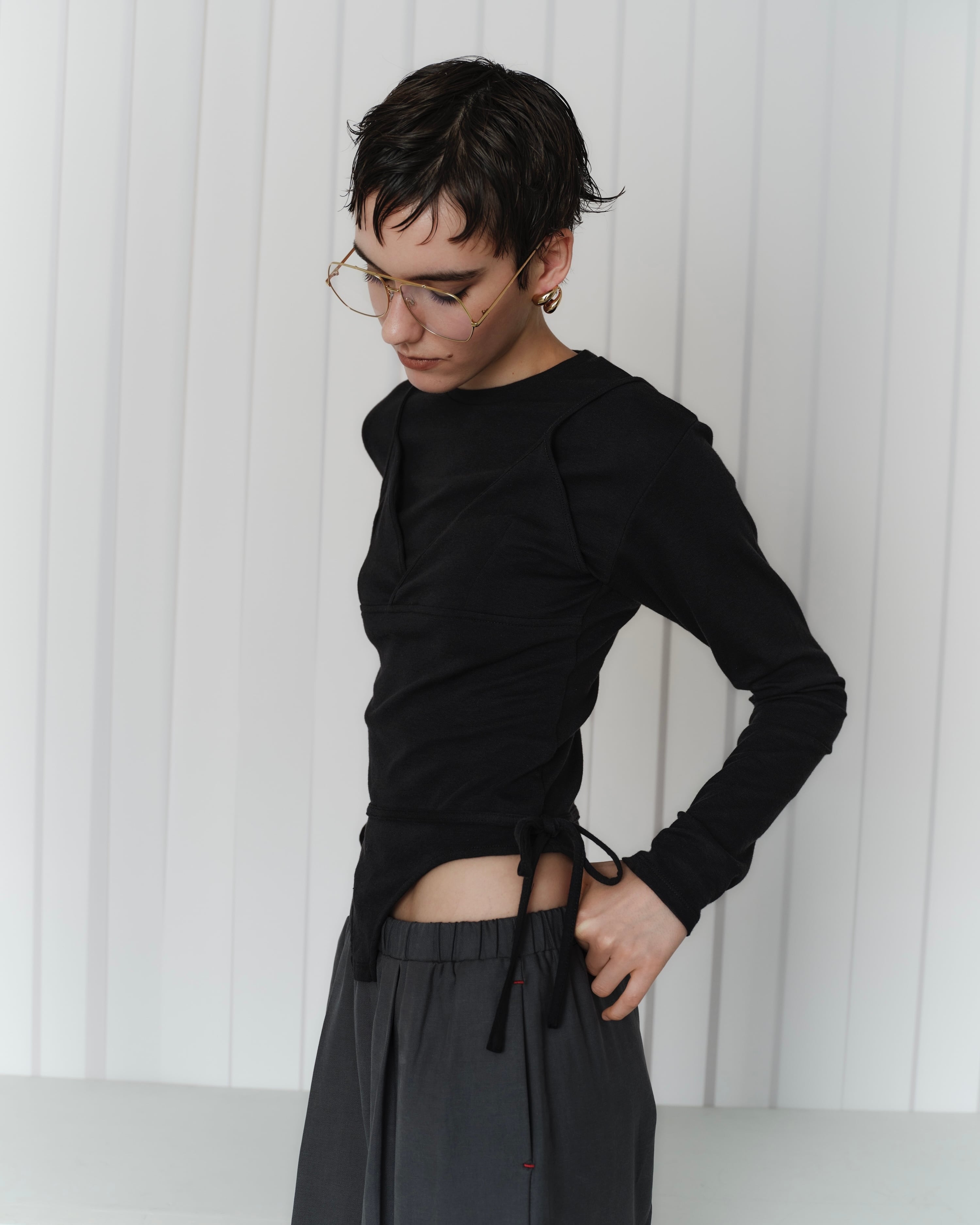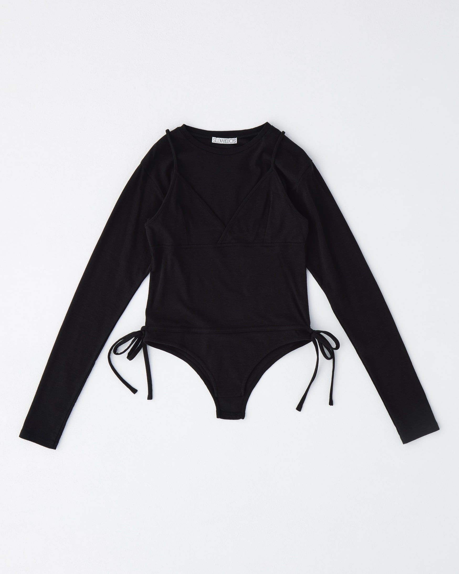 キャミソールのレイヤードデザインで、一枚で重ね着風に見せてくれ、裾はボディスーツのようなカッティングで少しエッジーな印象に。
