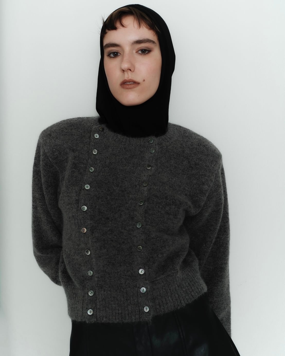 フロントのボタンが目を惹く、コンパクトなモヘア混のニットカーディガン。