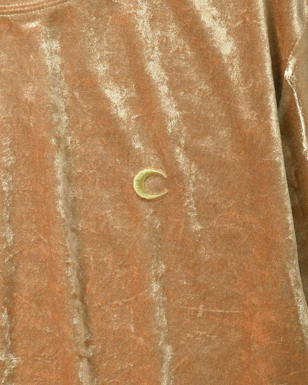 毛足の短い光沢のあるベロア生地にSELENAHELIOSのアイコンの月刺繍入り。