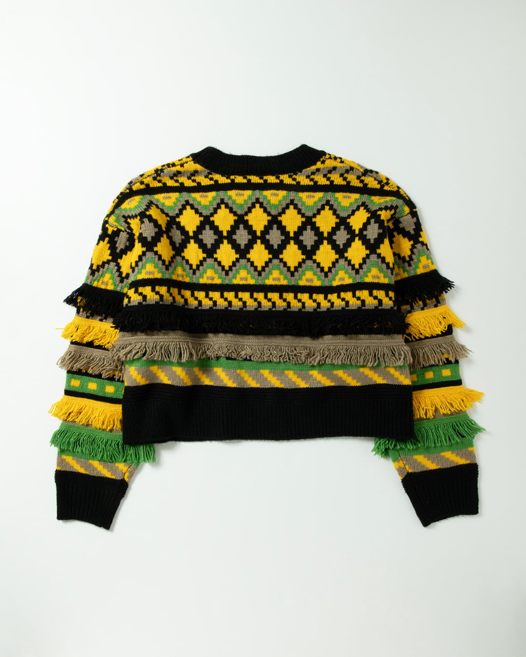 様々な柄を組み合わせた幾何学ボーダーのニット。