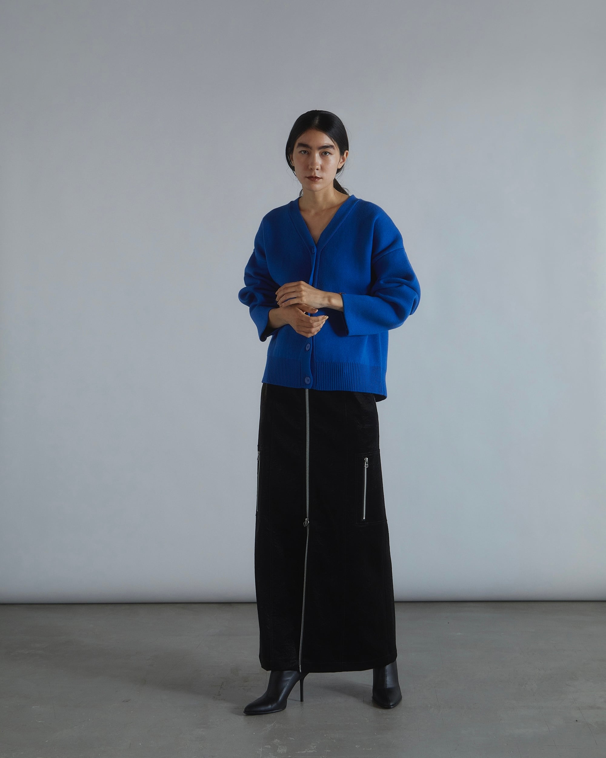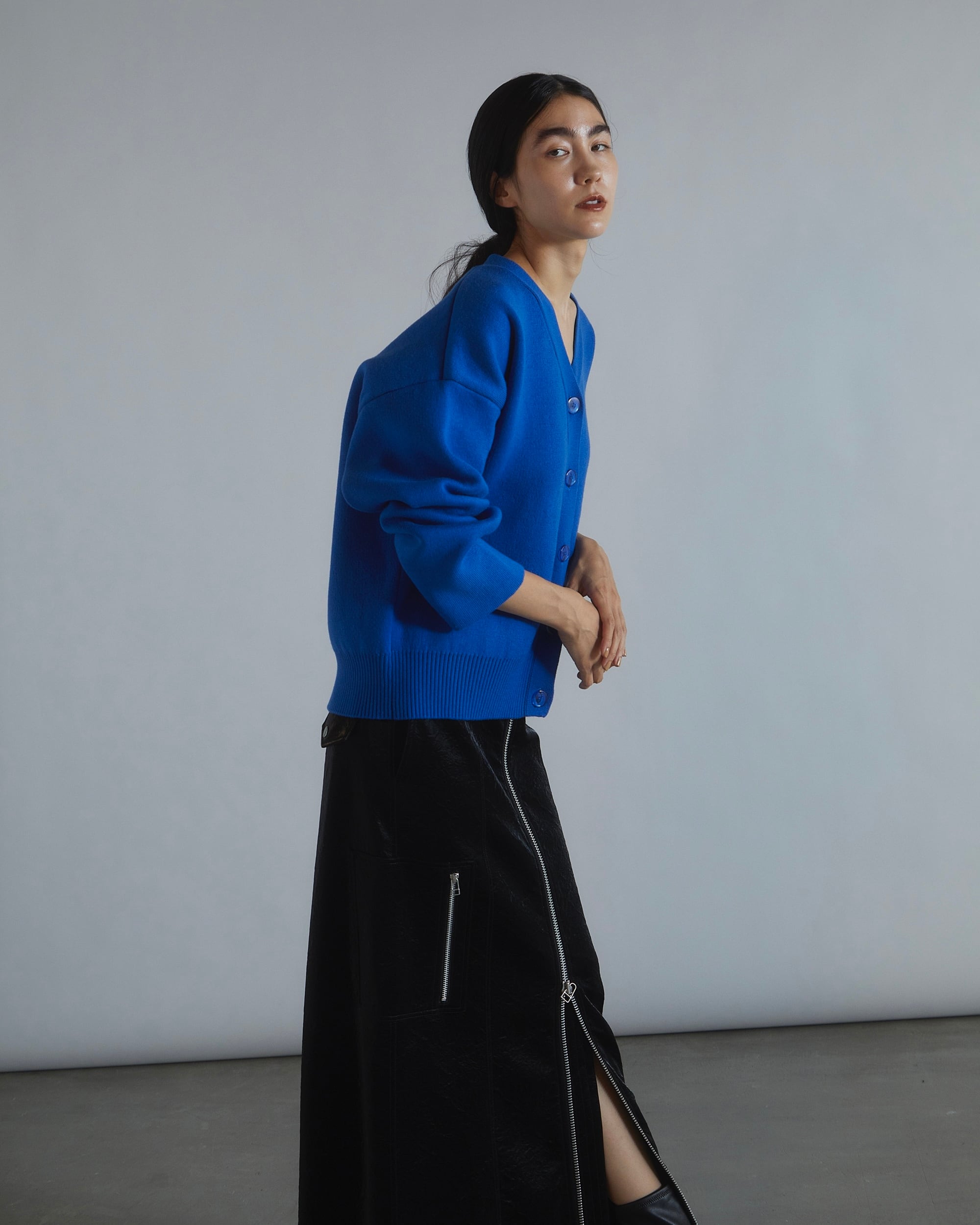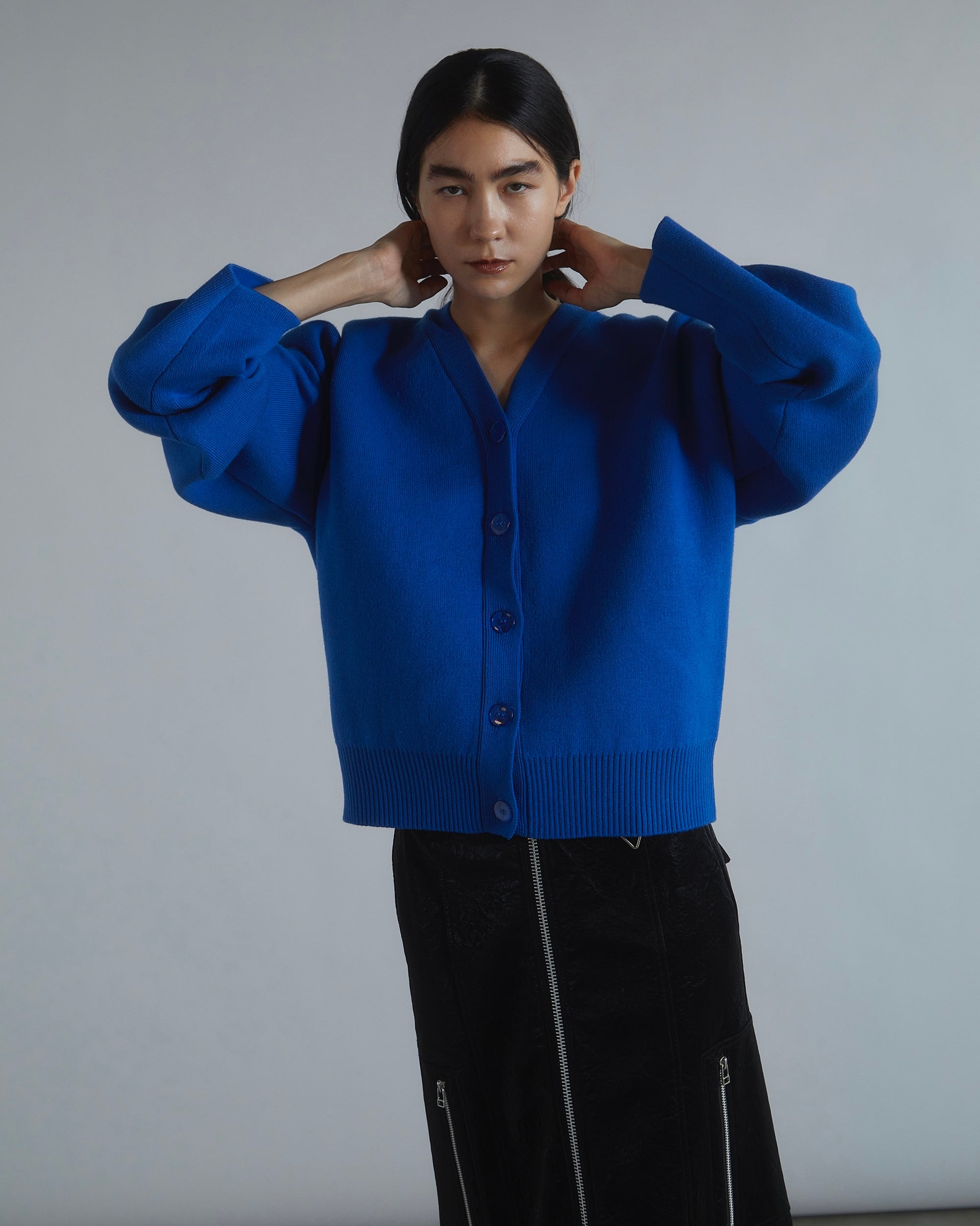 表と裏で違う糸で編んでいるので立体的な厚みがあり、アウターに近い感覚でご着用いただけます。