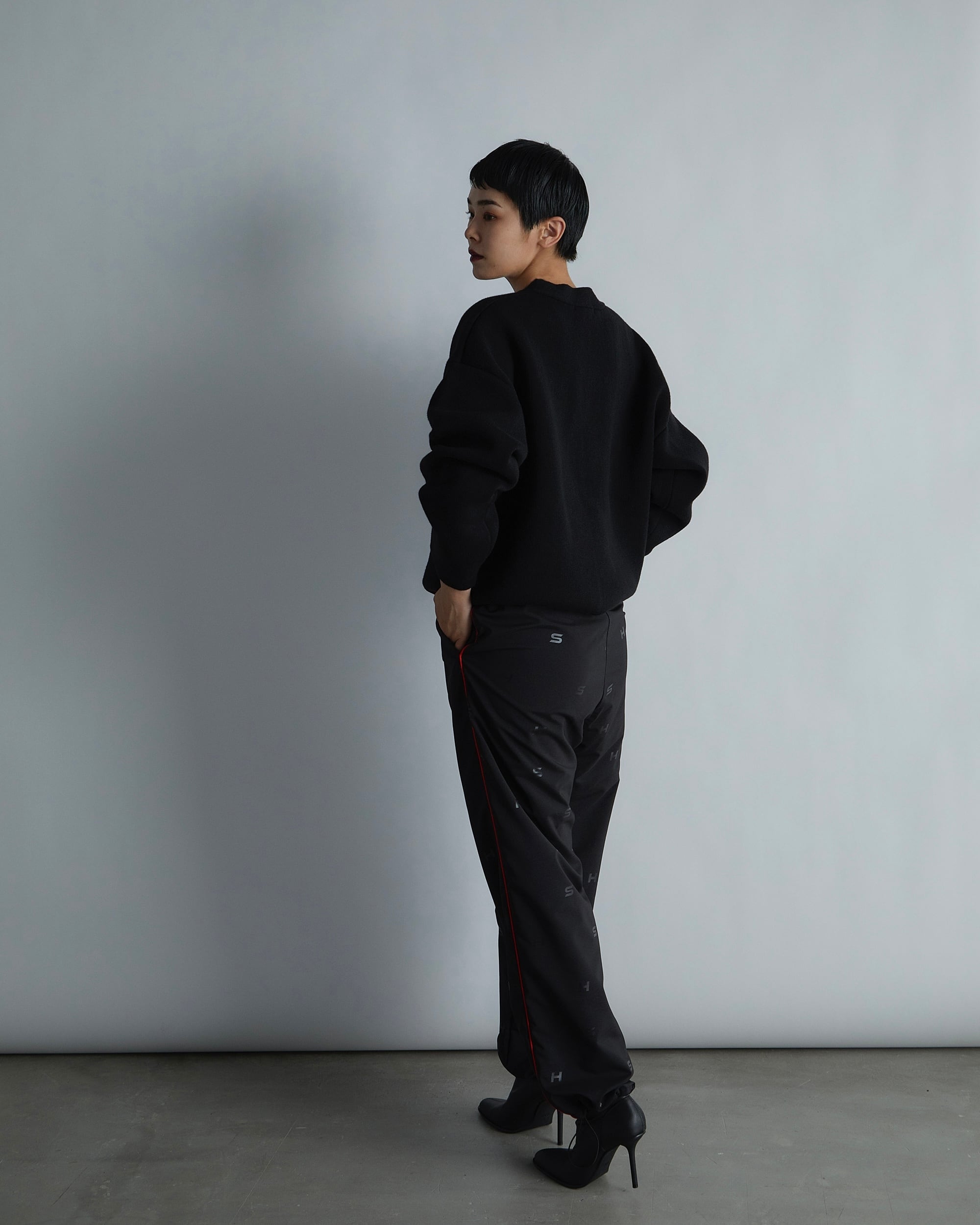 表糸はウール混の糸で暖かみがあり、裏糸はポリエステルで張り感のある糸を使用し、2種の糸が合わさることで立体的なシルエットを作り出しています。