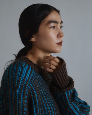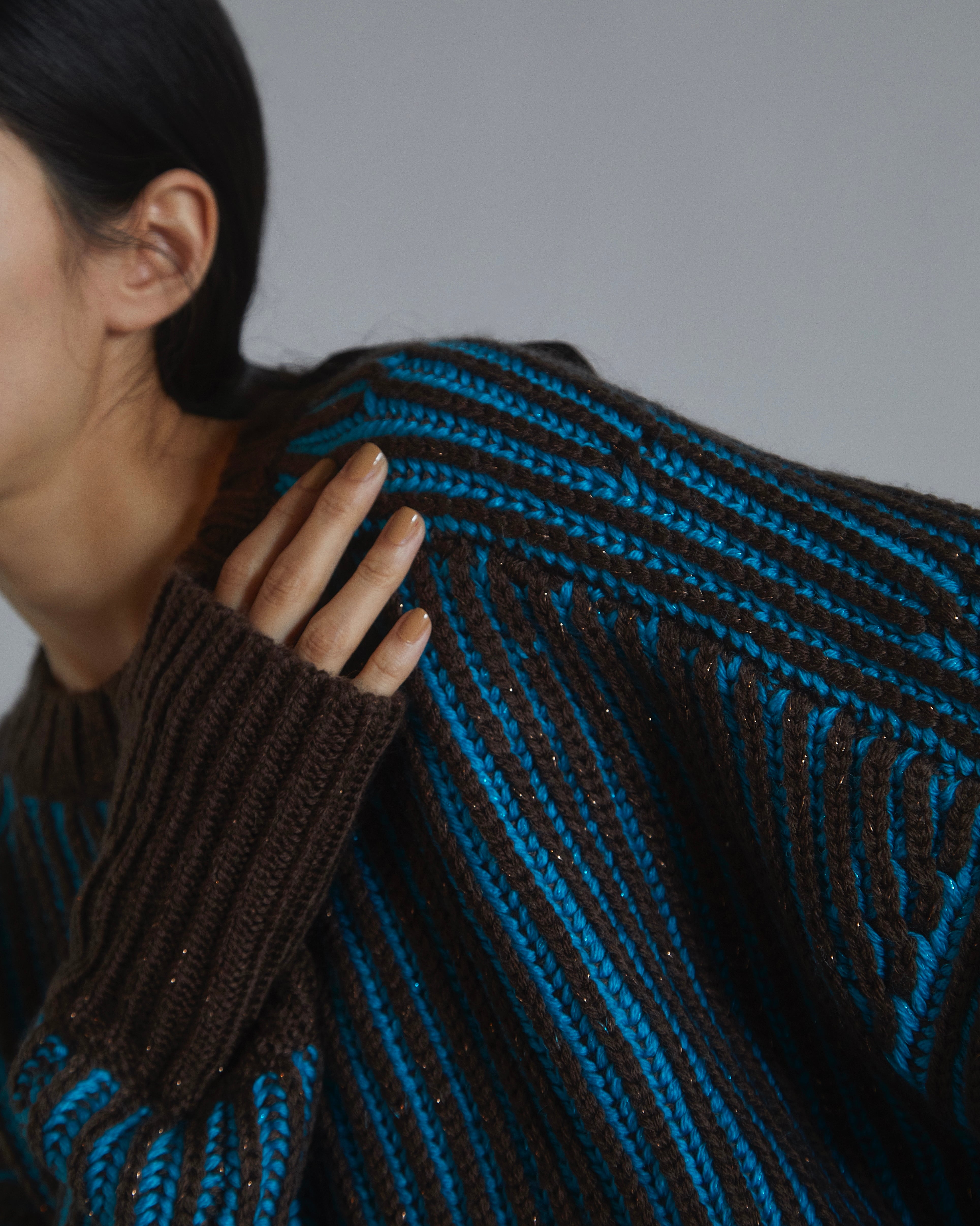 ラメ糸とウール混の糸を編み込んだ、立体的な配色のニットプルオーバー。