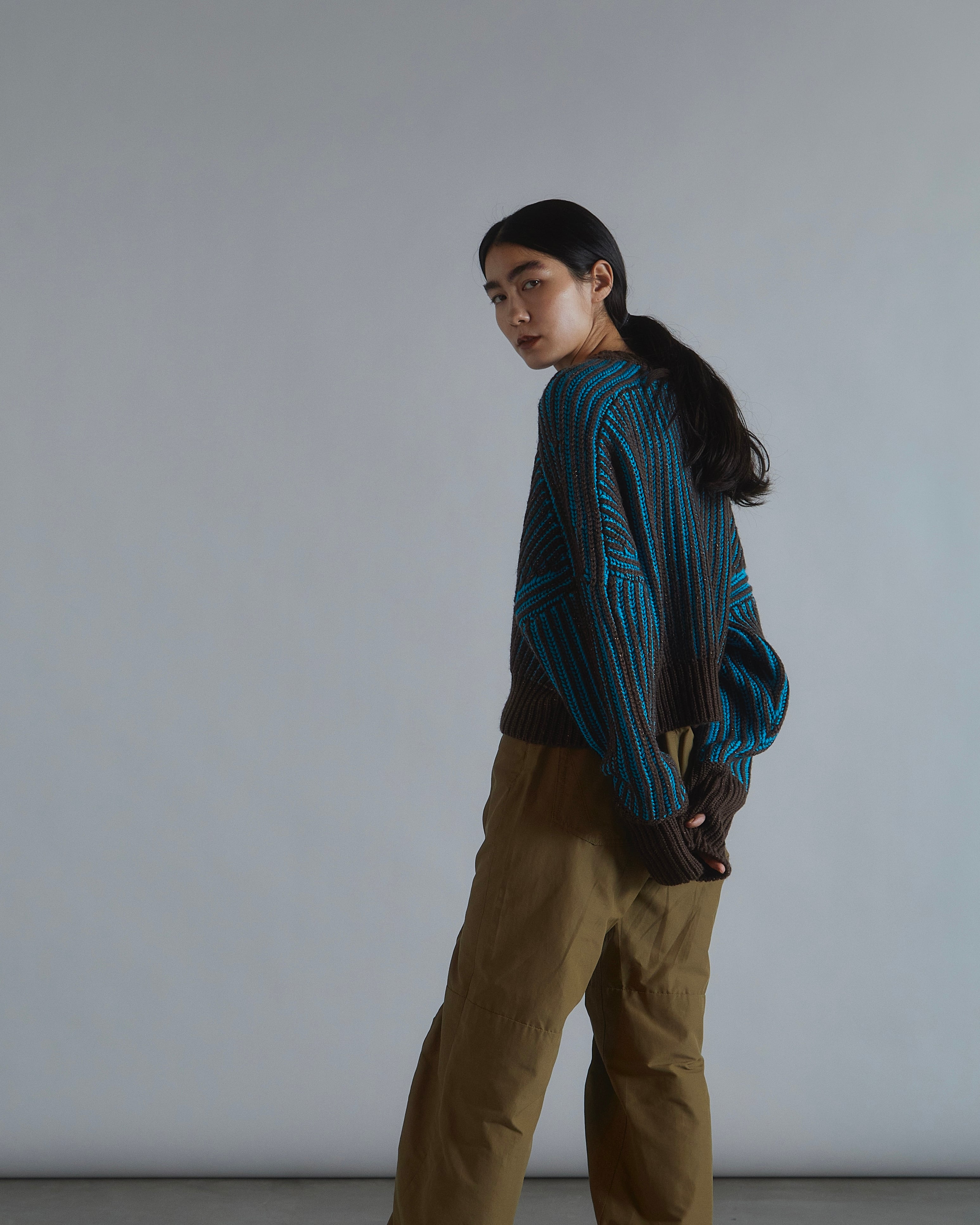 袖口にはフィンガーホールがあり、袖口はピタッと、少しルーズな袖のブラウンジングがポイント。