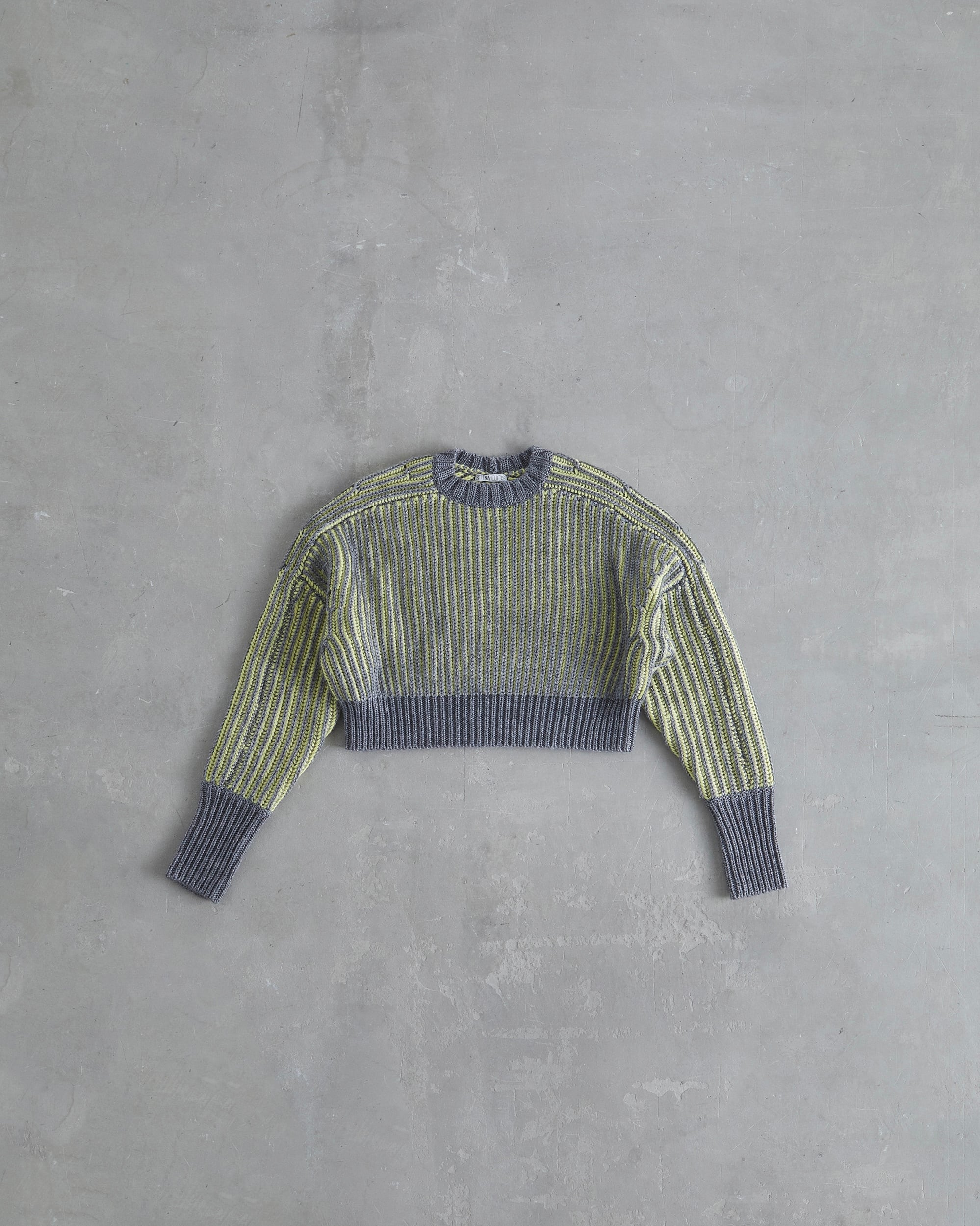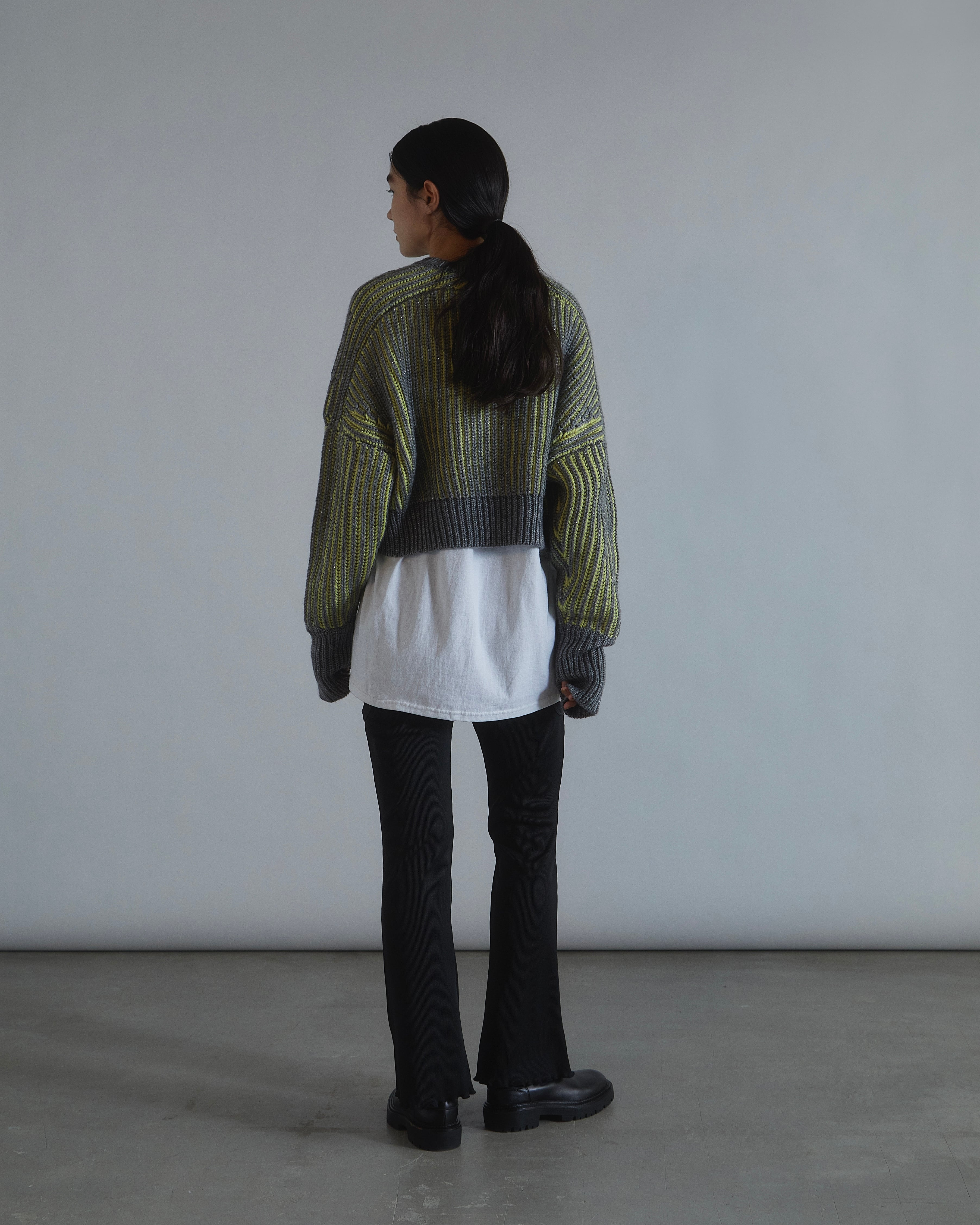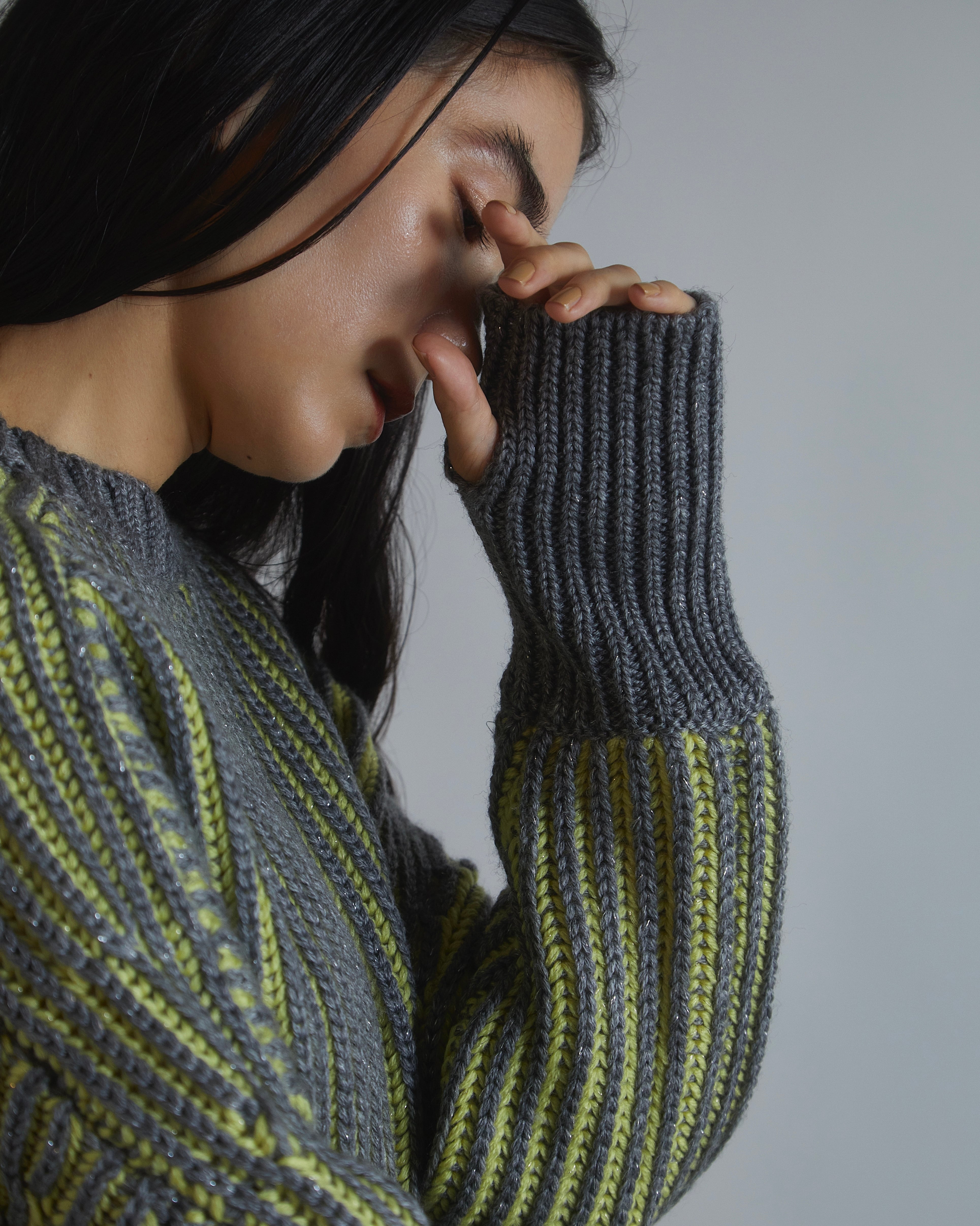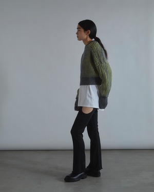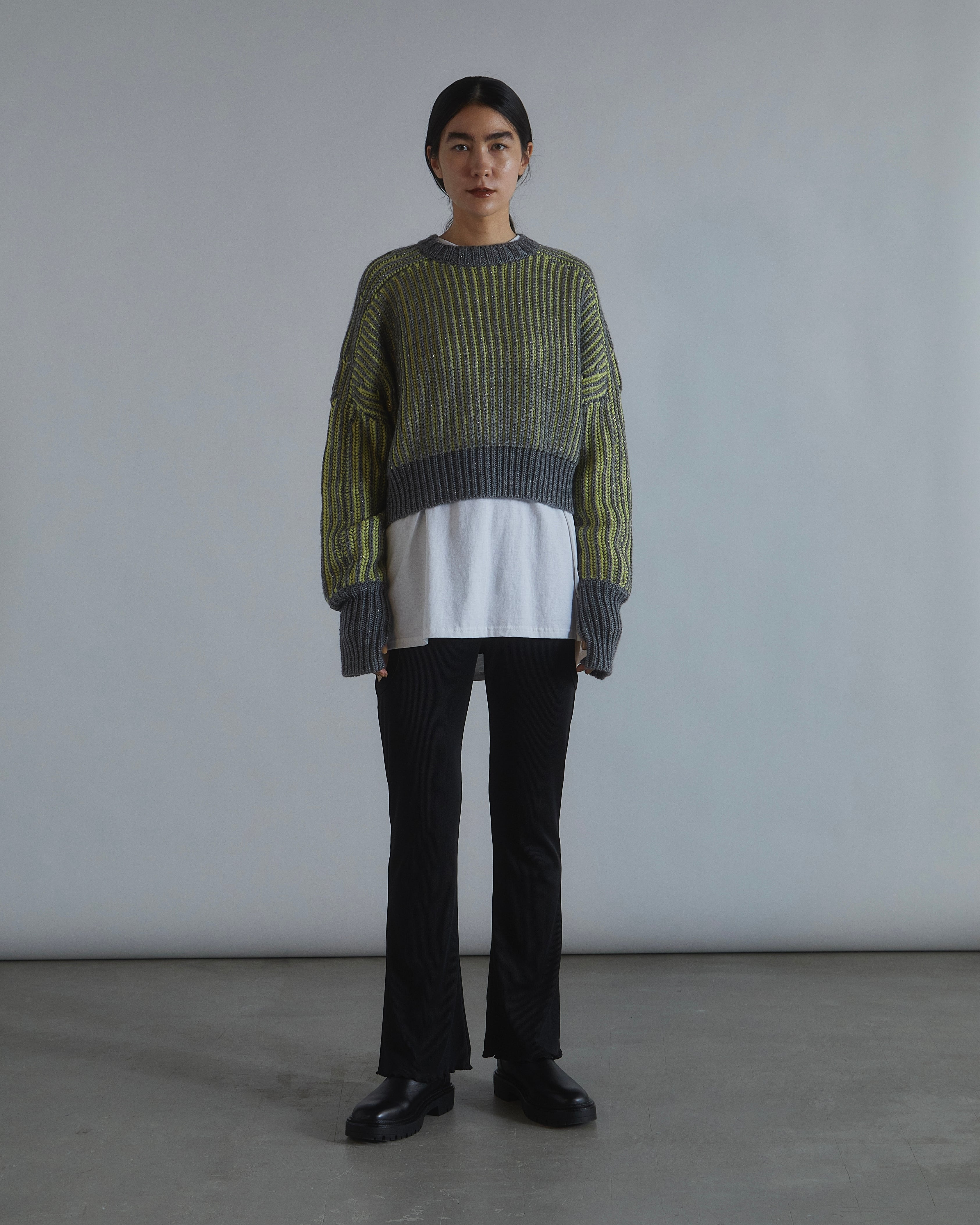 ラメ糸とウール混の糸を編み込んだ、立体的な配色のニットプルオーバー。 ドルマン風なシルエット、ショート丈でレイヤードスタイルも決まります。 袖口にはフィンガーホールがあり、袖口はピタッと、少しルーズな袖のブラウンジングがポイント。 ドライクリーニング。 Acrylic69% Wool27% Polyester4% size F : 着丈38cm 身幅63cm 袖丈81cm (モデル身長 172cm)