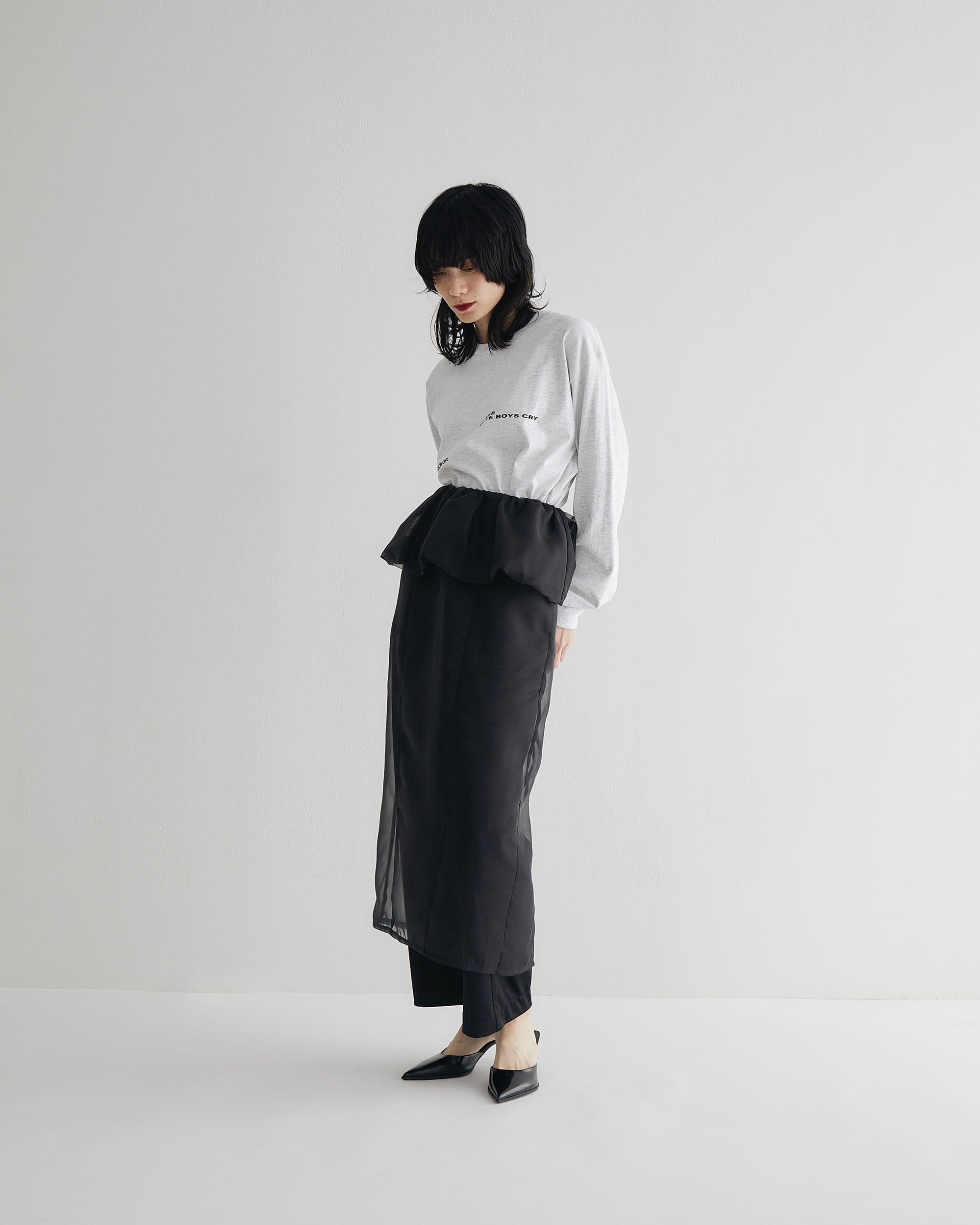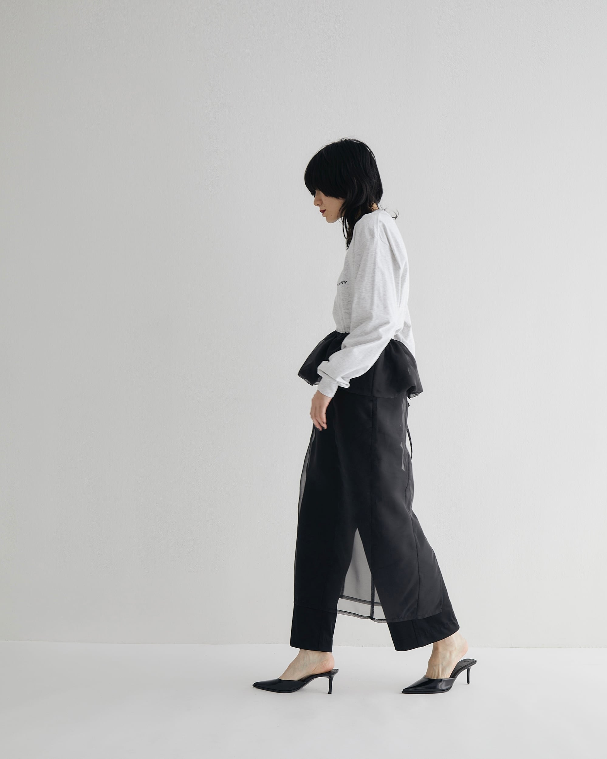 オーガンジー素材のパフスカートは、合わせるボトムによって表情を変えれる万能アイテム。